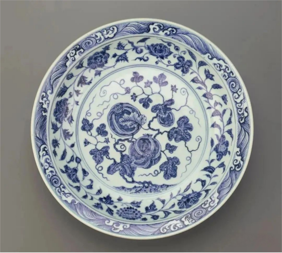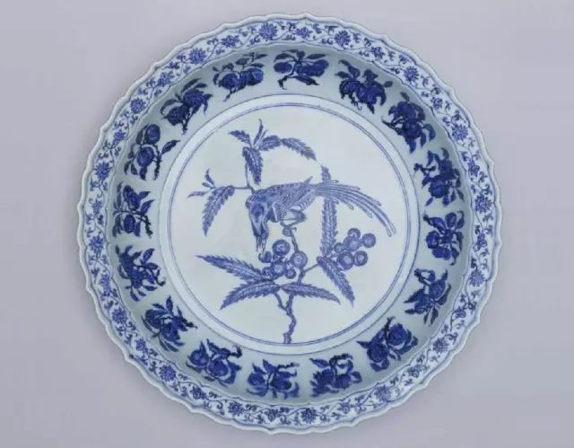 明永乐青花枇杷绶带鸟纹盘,该器件呈十六瓣菱花口,内底绘折枝枇杷与绶带鸟,内外壁绘折枝桃、石榴、枇杷纹。此盘造型大而规整,青花秀雅,纹饰布局疏朗,堪称典范。