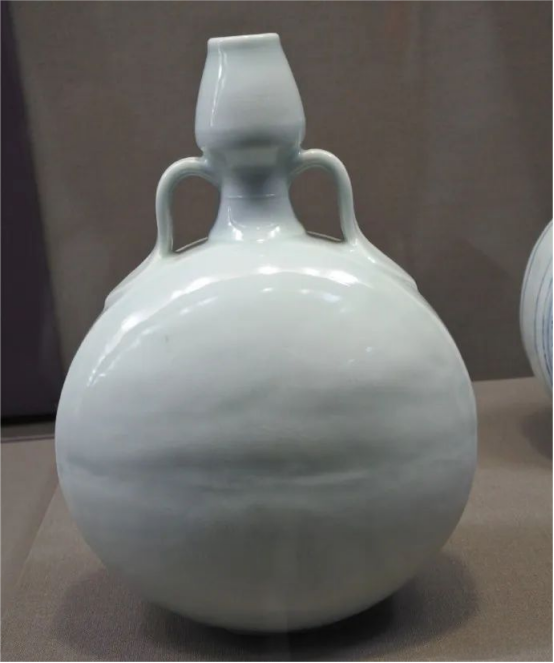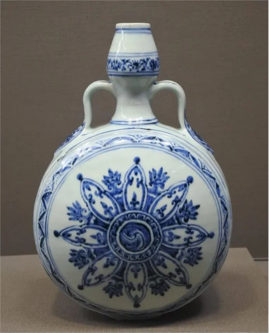 瓶葫芦式,收口,束颈,圆形扁腹,浅圈足。中部两节葫芦间有如意形双耳。瓶上部饰缠枝花纹,下腹部两面各绘轮花一朵,周围环绕花叶纹一周。无款识。明永乐青花呈色浓艳,可见结晶斑。此瓶应是受西亚器物风格的影响而烧制的。