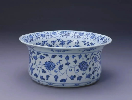 盆折沿,腹垂直,平底露胎。里外青花装饰。盆中沿绘缠枝花一周,内壁绘缠枝花7朵;盆底周边回纹装饰,回纹内绘八瓣团花,花瓣呈变形蕉叶纹,纹内巧绘暗八仙。盆外沿绘折枝花卉8朵,外壁绘缠枝花卉7朵,底边绘变形朵花纹一周。青花呈色浓艳,有晕散,乃“苏泥勃青”料所致。纹饰繁复生动,层次分明,是永乐时期受西亚国家金银器的影响而创烧的一种新器型。